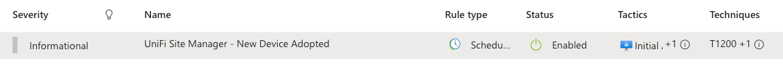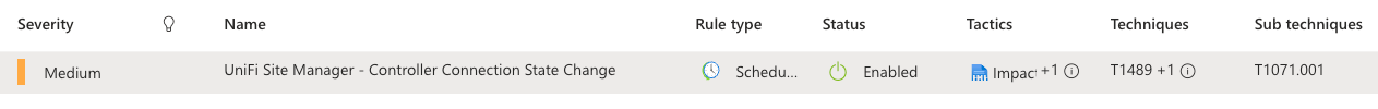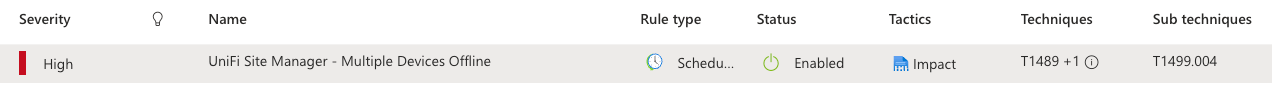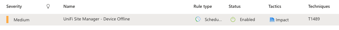 Data Connector Health monitors whether data is being ingested from each of the four UniFi data tables. If any connector stops receiving data for more than 30 minutes, the rule generates an alert. This ensures you're notified if visibility into your UniFi infrastructure is compromised.