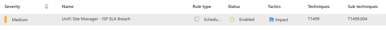 Sub-techniques provide additional granularity. ISP performance rules include T1498.001 (Direct Network Flood) and T1499.004 (Application or System Exploitation). Controller connection rules include T1071.001 (Web Protocols). This mapping ensures your UniFi detections integrate with broader threat intelligence and SOC workflows.