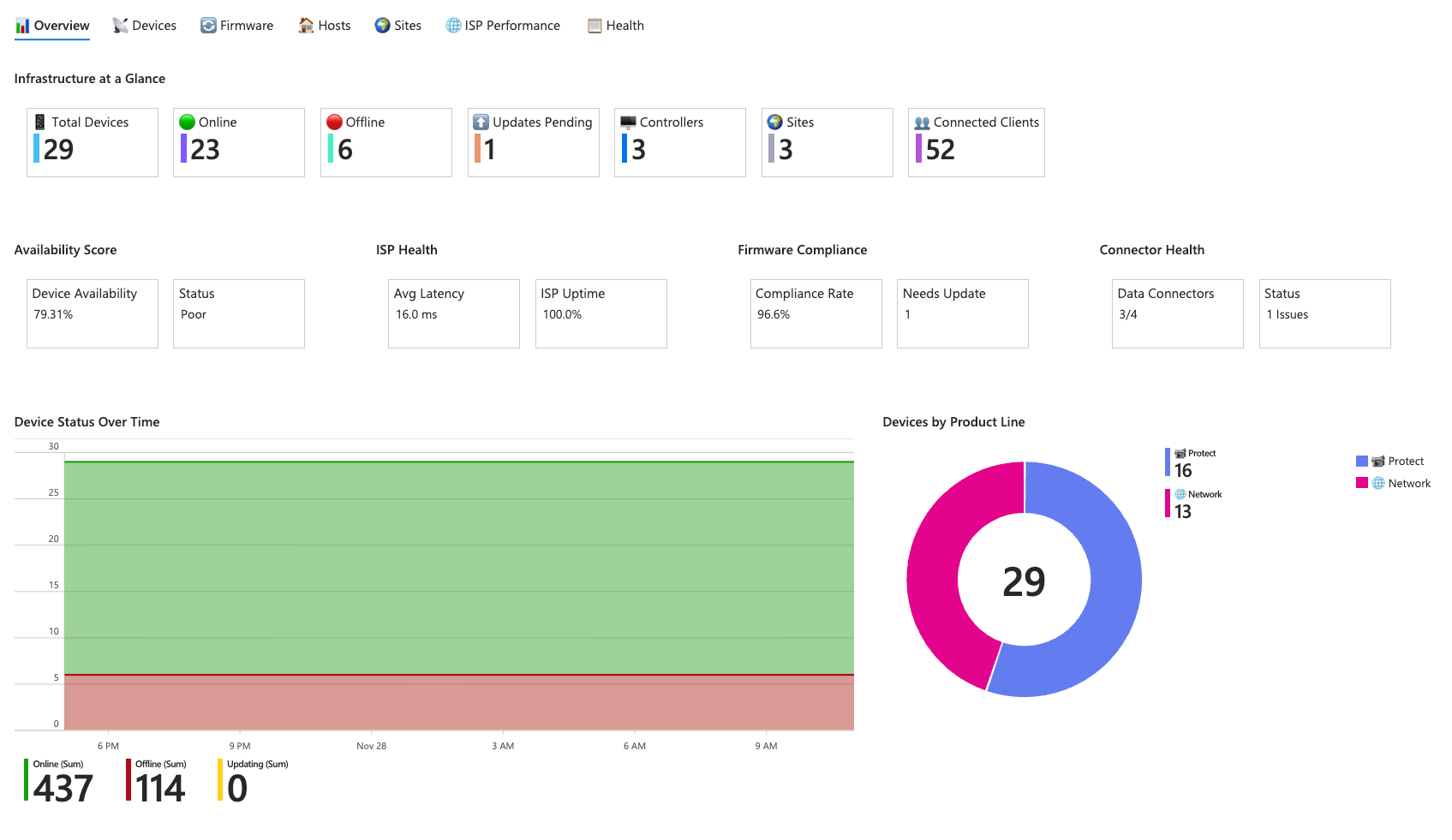 The Overview tab serves as your landing page, presenting infrastructure metrics in a series of tiles. You can see total device counts alongside online, offline, and updating statuses. An availability score calculates the percentage of devices currently operational, with thresholds indicating whether your network health is excellent or if it's like mine, poor.