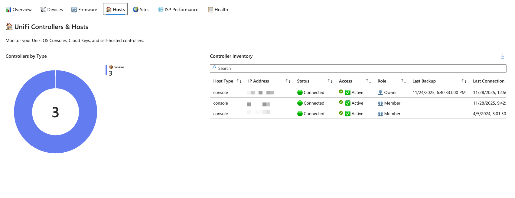 The Hosts tab focuses on your UniFi controllers. Whether you're running UniFi OS Consoles, Cloud Keys, Dream Machines, or self-hosted Network Servers, the controller inventory provides visibility into IP addresses, connection status, remote access configuration, and backup status.