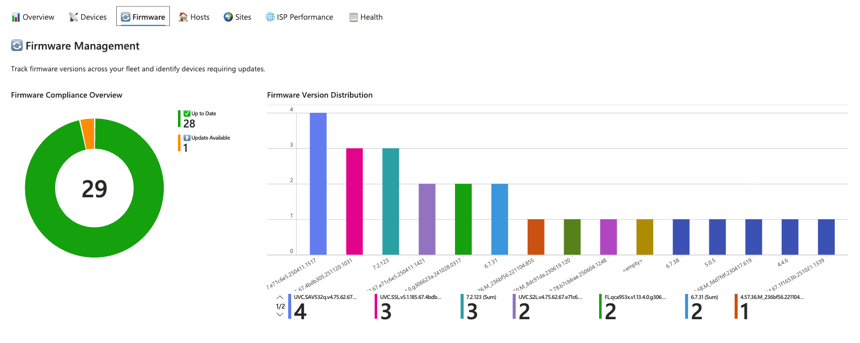 Keeping firmware current is essential for security and stability. The Firmware tab visualises compliance as a pie chart comparing up-to-date devices against those with updates available. A distribution chart shows which firmware versions are most prevalent, helping identify clusters of outdated devices.